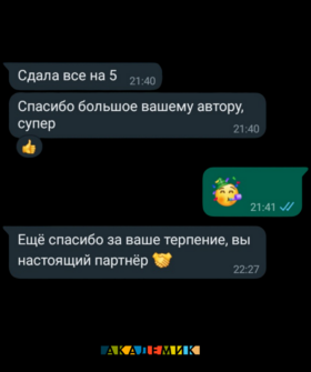 Но как найти столько сил, а, главное, времени, чтобы получить отличную оценку? Ведь даже у прилежных студентов бывают форс-мажоры. Выход есть! Обратитесь за помощью к авторам, которые регулярно пишут такие работы. В компании «Академик» все виды работ на заказ выполняют опытные специалисты, прекрасно знающие основные требования к содержанию и оформлению. Кроме того, мы практикуем дополнительную проверку уже выполненного заказа отделом контроля качества, поэтому все требования к нему (как по методическим рекомендациям, так и по устным указаниям преподавателя) будут выдержаны.